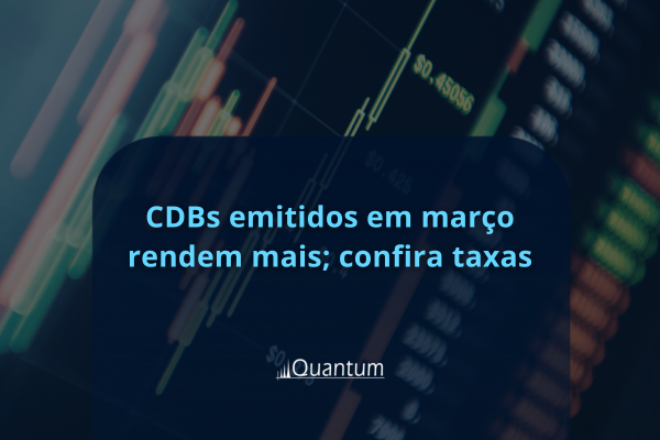 Levantamento da Quantum Finance sobre títulos de renda fixa emitidos em março mostra que os CDBs ofereceram remuneração maior em março de 2026 do que os emitidos no mês anterior. Nos papéis que pagam %CDI, a média da remuneração das emissões de bancos pequenos e médios com vencimento entre três e 12 meses foi de 102,2% do CDI, contra 101,4% em fevereiro. Já entre os bancos grandes, as taxas oferecidas aos investidores ficaram em 98,3% do CDI. O conteúdo também apresenta as taxas dos títulos indexados à inflação e os prefixados. Especialistas ouvidos pela InfoMoney comentam o cenário.