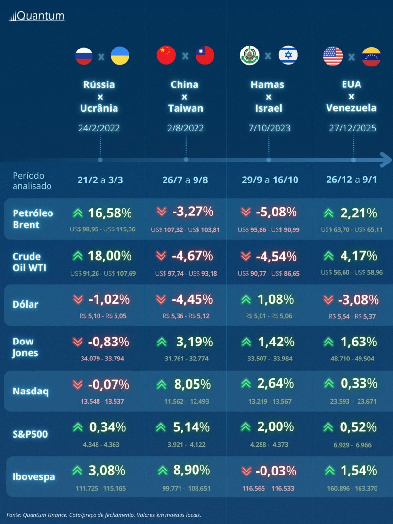 A história recente está cheia de conflitos globais. Desde a invasão da Ucrânia pela Rússia (2022) até a recente intervenção dos Estados Unidos na Venezuela (2026), os ativos sofrem oscilações, tornando o cenário geopolítico um fator de preocupação constante para analistas e gestores de recursos.
