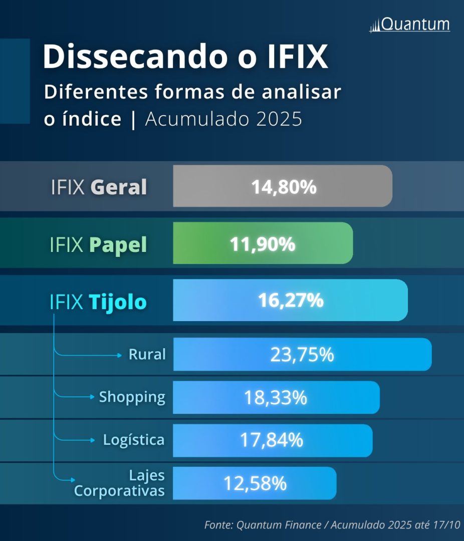 Dentro da categoria tijolo, o destaque fica com os fundos rurais, que acumulam 23,75% de rentabilidade em 2025, seguidos por shoppings (+18,33%) e logística (+17,84%).
