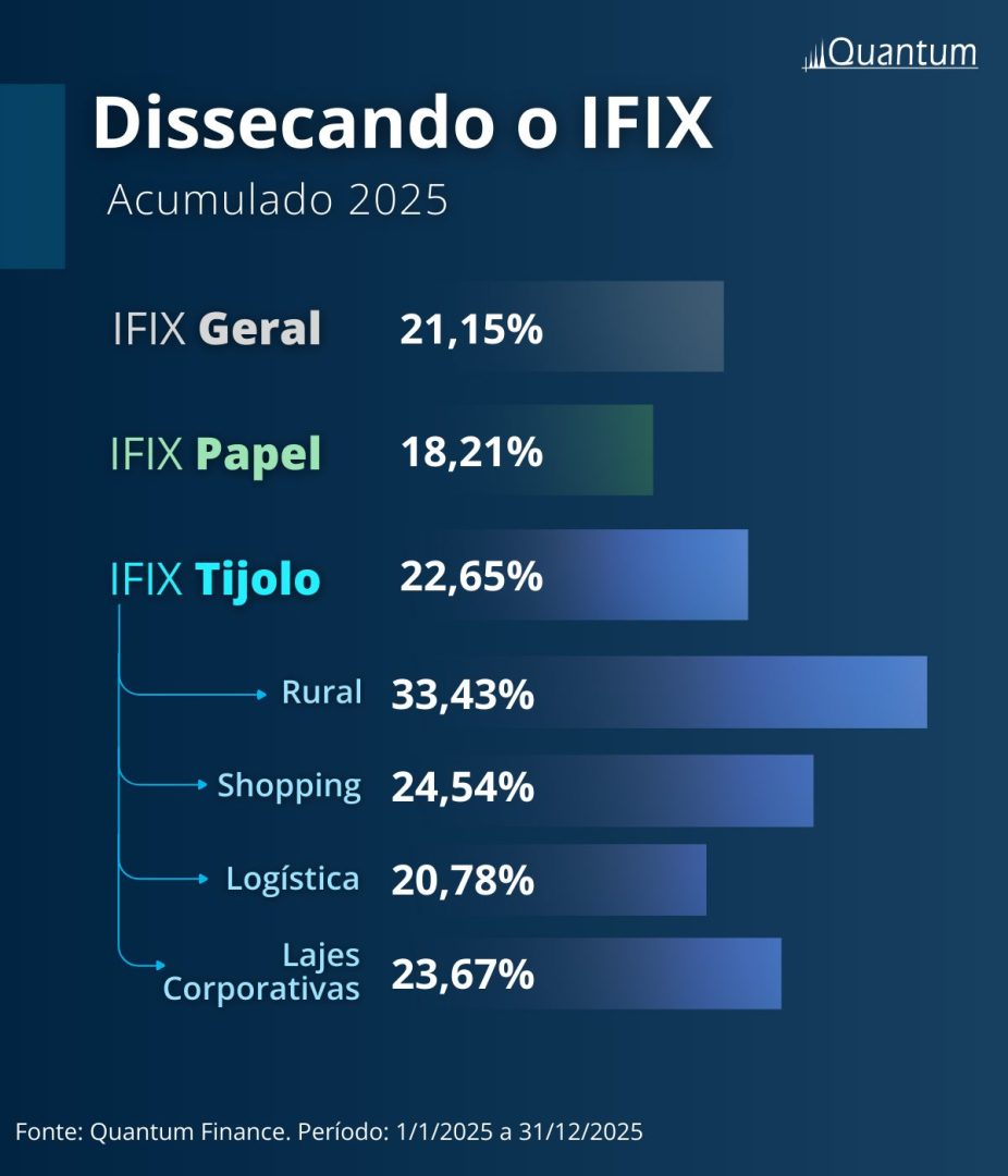 Até o fim de novembro, o IFIX, principal índice da categoria, seguiu com alta de 16,34%. A Quantum, que desenvolveu subíndices para melhor acompanhamento do mercado, também decompôs o desempenho dos fundos de papel e tijolo.