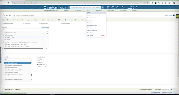 A Quantum organiza sua plataforma para que o profissional do mercado financeiro acesse dados confiáveis e construa suas próprias interpretações. O objetivo é que cada insight seja sustentado por séries extensas, informações auditáveis e visualizações claras.