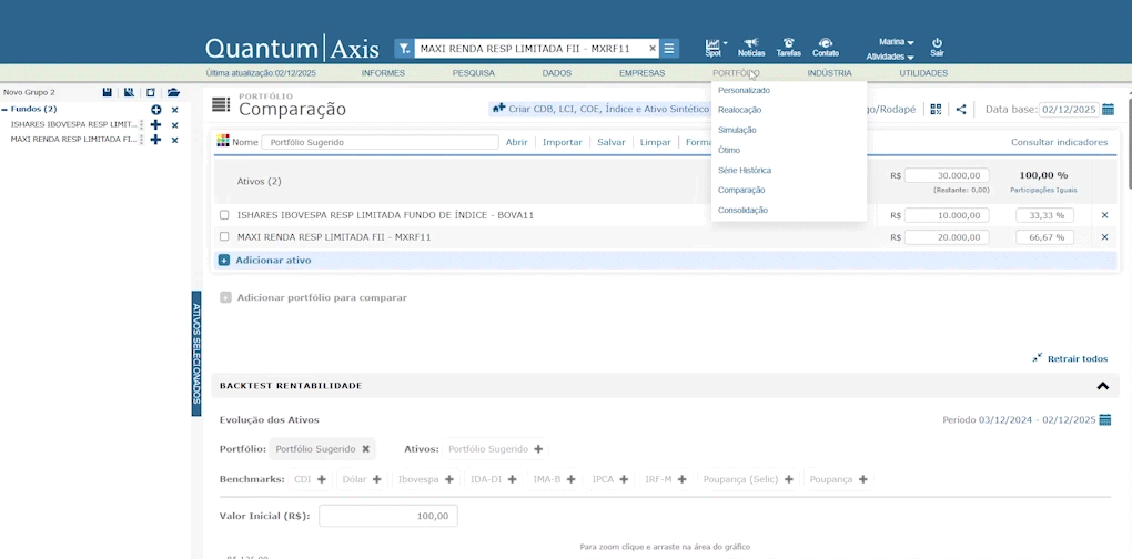 A barra de Portfólio oferece simulações completas de carteira, permitindo testar cenários, comparar alocações atuais com estratégias alternativas e avaliar a sensibilidade a mudanças de mercado.