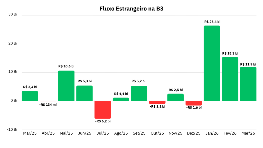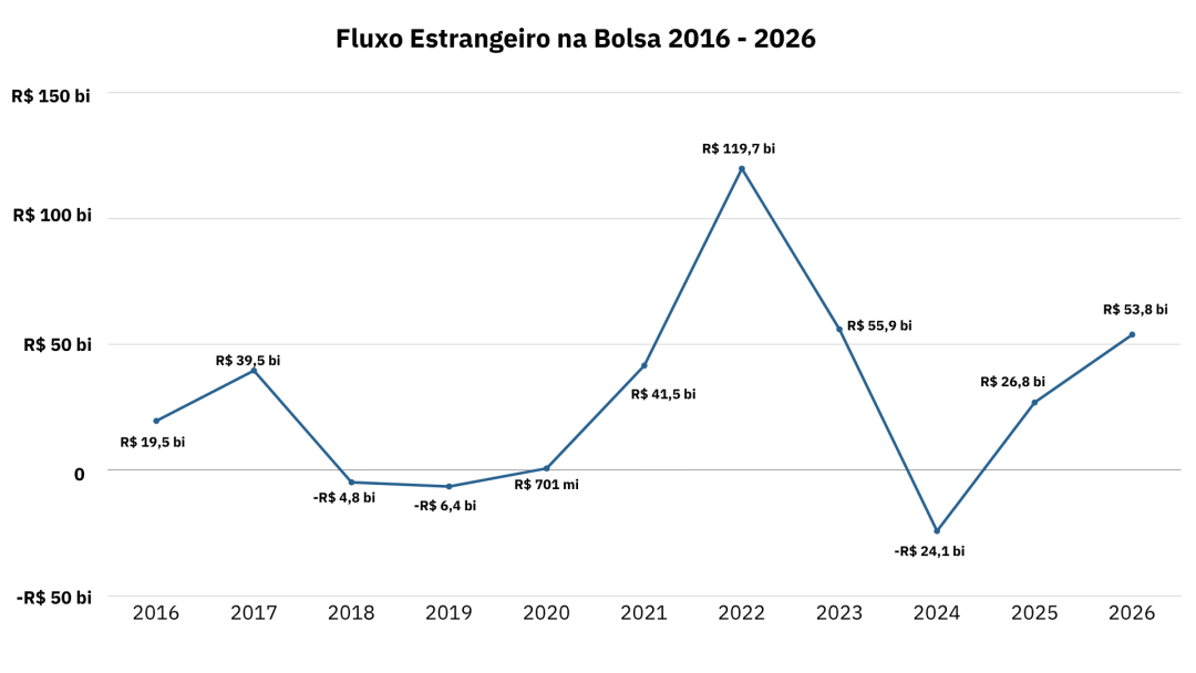 Com apenas 4 meses com saldos negativos (abril, julho, outubro e dezembro), o acumulado de investimentos estrangeiros na Bolsa, em 2025, superou a maca de R$ 26 bilhões (considerando IPOs e follow-ons).