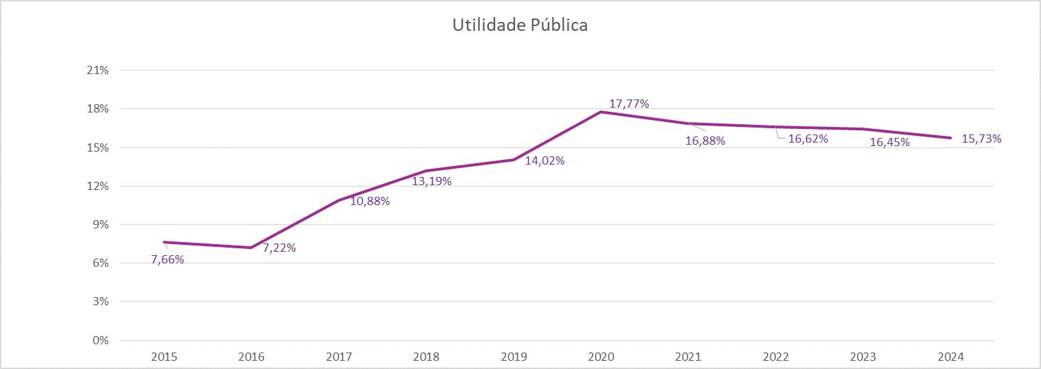 - Utilidade Pública: contempla empresas de setores essenciais como energia elétrica, saneamento e gás. O setor contempla cerca de 40 empresas, e sai de um patamar inferior 10% para alcançar médias próximas de 16% nos últimos 5 anos. Houve um pico de 17,8% em 2020, mesmo em um ano de crise global. Essa constância reflete a previsibilidade das receitas reguladas, característica típica de empresas desse segmento, menos expostas a ciclos econômicos.
