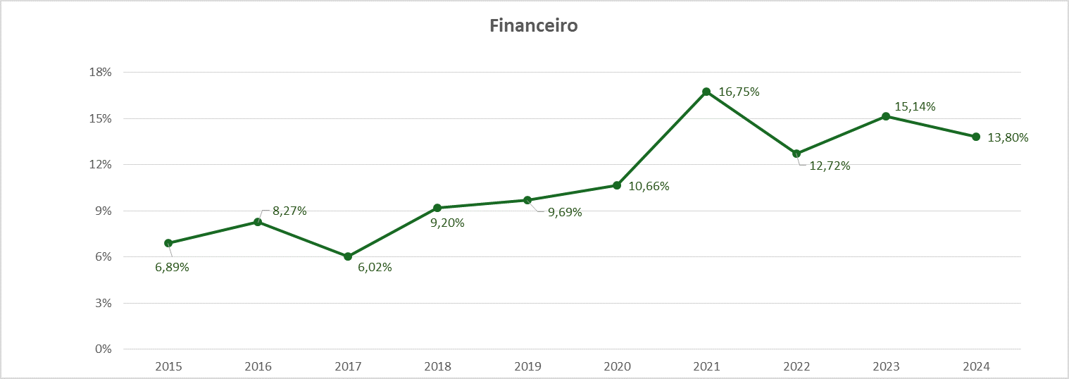 - Setor Financeiro: O setor Financeiro também se destacou pela solidez dos retornos. O ROE médio variou de 6,9% em 2015 para 13,8% em 2024, com estabilidade ao longo da série. Mesmo em períodos de estresse econômico, o segmento bancário manteve margens robustas, sustentado por escala, eficiência operacional e ganhos com juros.
