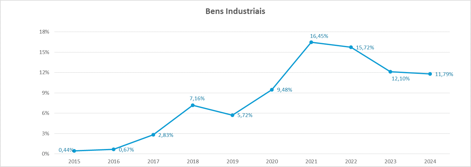 - Bens Industriais: O setor mostrou trajetória de recuperação. Saiu de níveis próximos de 0,4% em 2015 para 11,8% em 2024, com destaque para 2021, quando atingiu 16,5%. Esse avanço reflete a retomada gradual da indústria brasileira após anos de retração, além de ganhos de produtividade e aumento de exportações em nichos específicos.