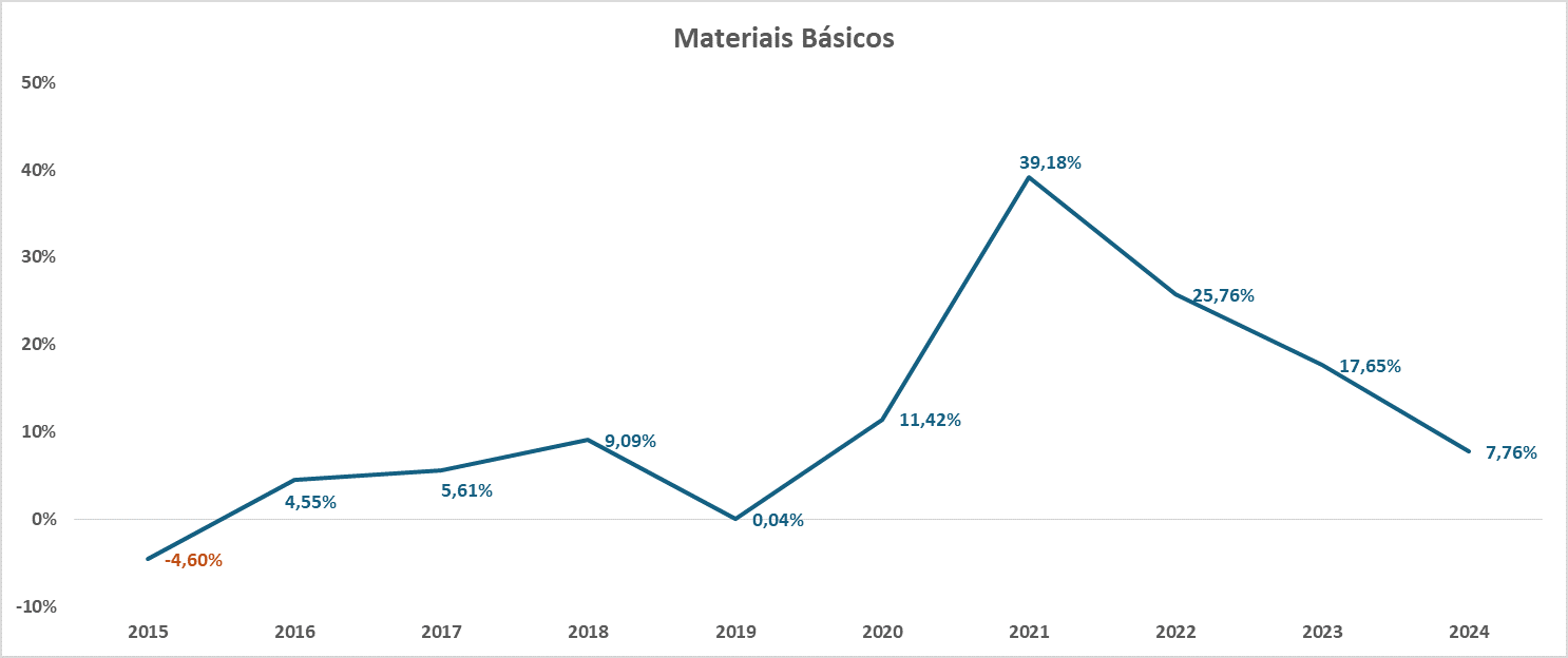 - Materiais Básicos: Esse foi o mais volátil da série. O ROE do segmento de empresas como mineração, siderurgia e madeira saltou de -4,6% em 2015 para 39,2% em 2021, impulsionado pelo boom das commodities. Os retornos recuaram para 7,8% em 2024. O comportamento reforça o caráter altamente cíclico do segmento, sensível às flutuações internacionais de minério, aço e papel e celulose.