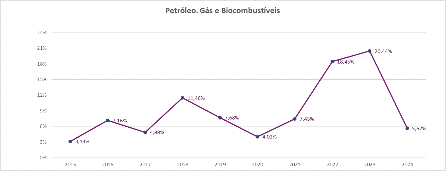 - Petróleo, Gás e Biocombustíveis: O setor apresentou forte recuperação pós-pandemia. De 3,1% em 2015, o ROE subiu para 20,4% em 2023, refletindo o aumento do preço do petróleo e o reposicionamento das empresas brasileiras no cenário global.