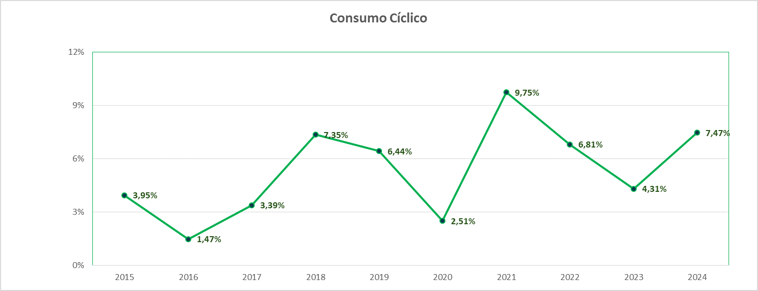 - Consumo Cíclico: Sensível à renda e ao crédito, o segmento manteve rentabilidade moderada ao longo da década. Após atingir 2,5% em 2020, o ROE avançou para 7,5% em 2024, acompanhando a melhora do consumo doméstico e a queda do desemprego. O setor continua sendo um termômetro direto da atividade econômica interna.