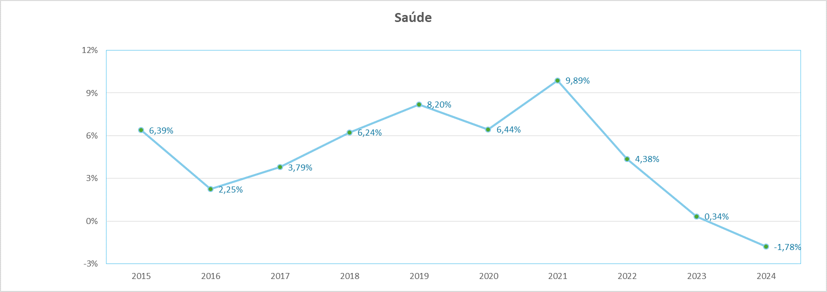 - Saúde: Apesar do crescimento estrutural, o ROE médio mostrou alta volatilidade — variando de -1,8% em 2024 a 9,9% em 2021. O aumento de custos operacionais e a concorrência reduziram margens, embora a tendência de longo prazo permaneça positiva, impulsionada pelo envelhecimento populacional e expansão dos planos privados.