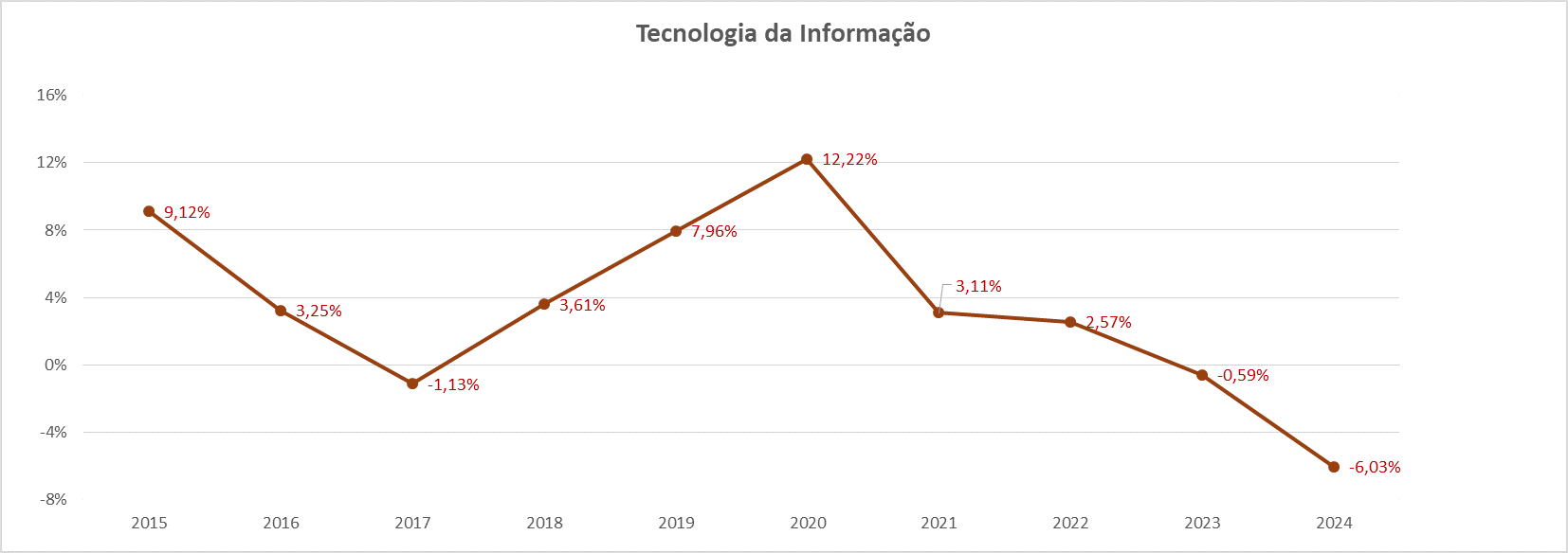 - Tecnologia da Informação: Mesmo sendo um dos mais promissores em inovação, o setor ainda apresenta desafios em rentabilidade. O ROE oscilou entre -6,0% em 2024 e 12,2% em 2020. Apesar disso, o número de companhias cresceu de 8 em 2015 para 15 em 2024, mostrando o amadurecimento do ecossistema tech.