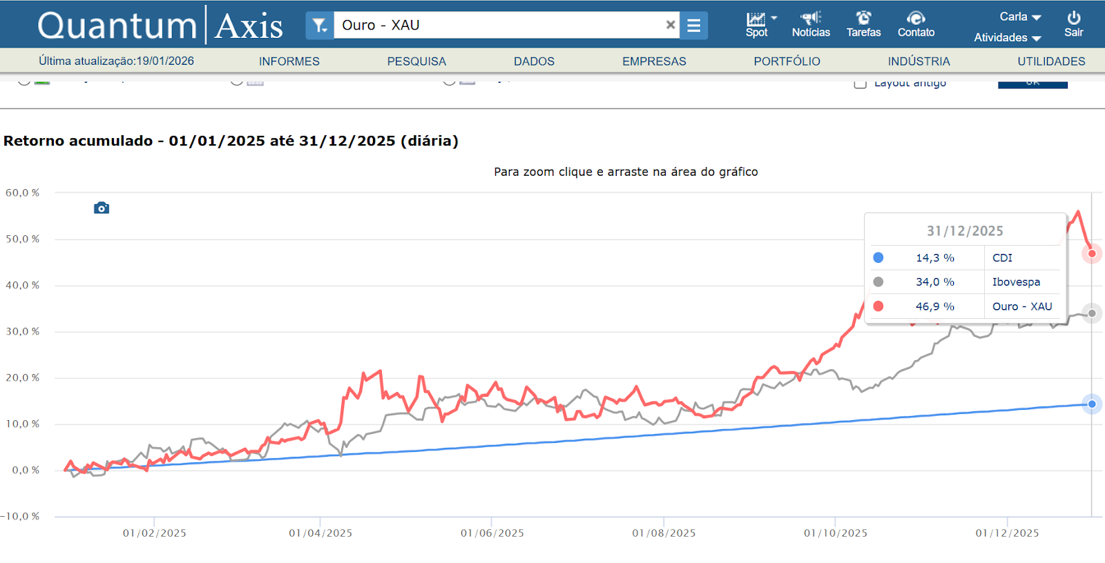 Observe a comparação no ambiente do Quantum Axis, que consolida séries históricas padronizadas e permite análises simultâneas entre ouro, índices de mercado e instrumentos de renda fixa: