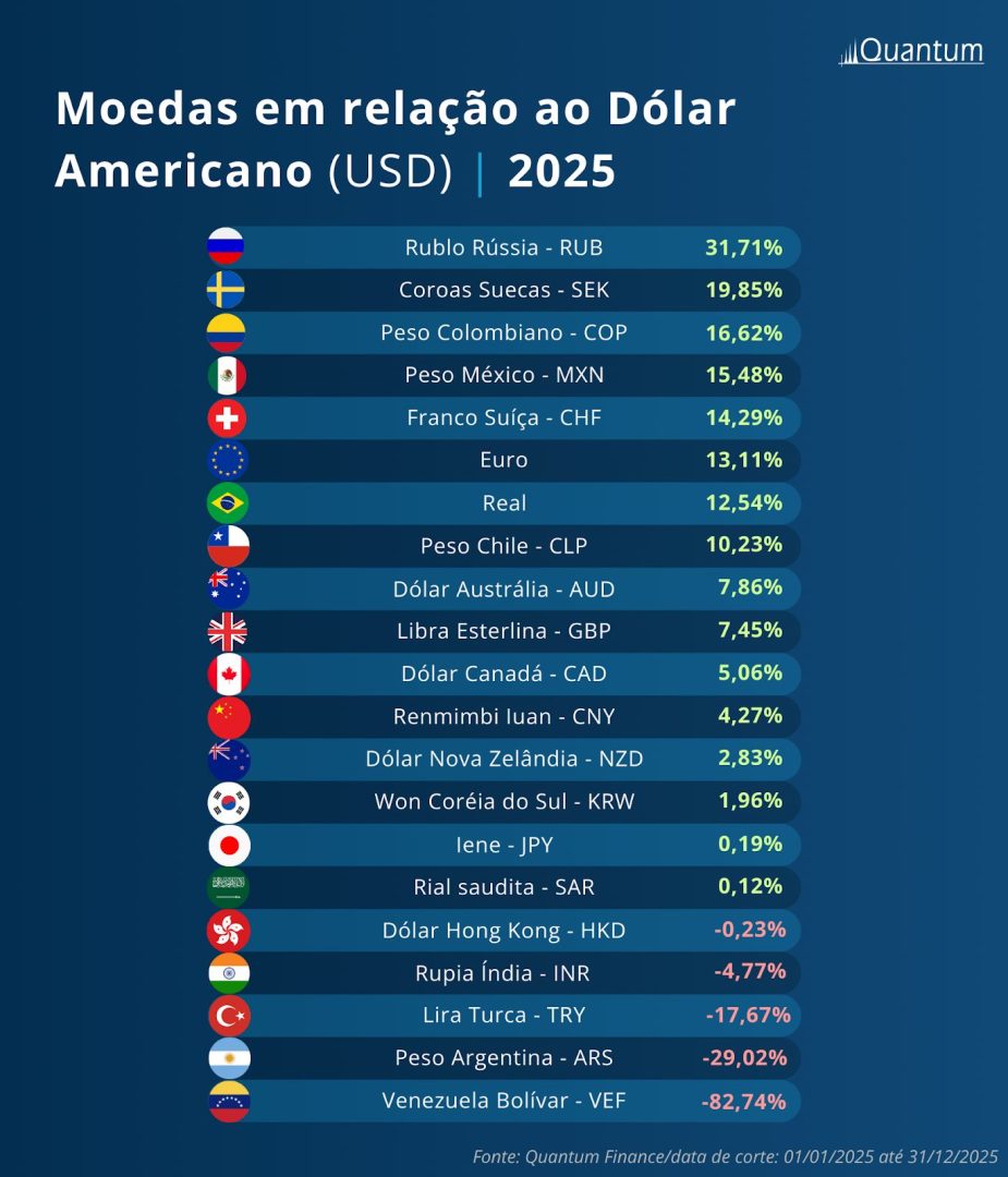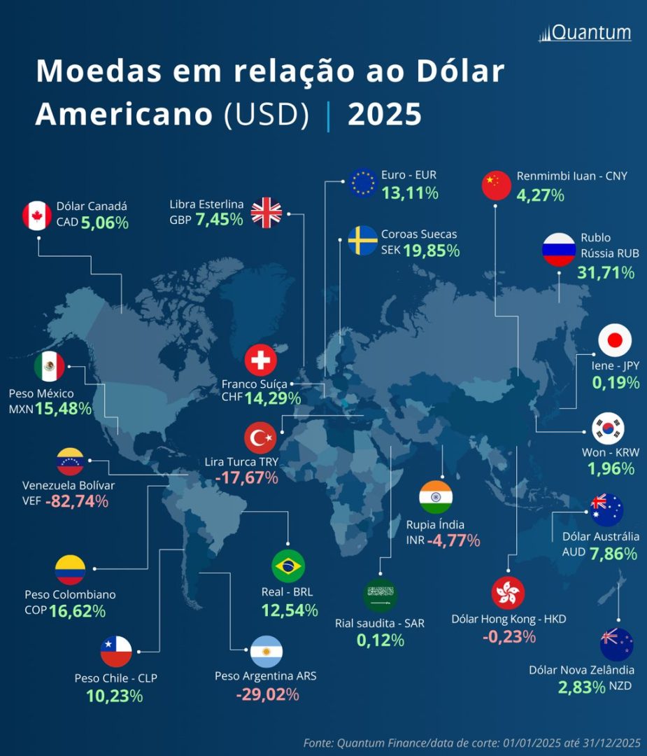 Esse cenário alimenta questionamentos sobre a sustentabilidade de regimes monetários no longo prazo. Como reflexo, diversas moedas apresentaram perda relevante de valor frente ao dólar em 2025, movimento que pode ser observado na imagem elaborada com dados da plataforma da Quantum.